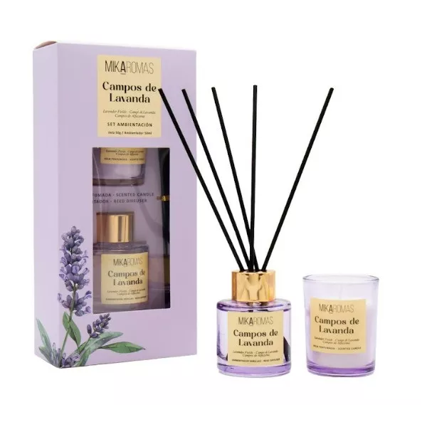 MIKAROMAS Zestaw Lawenda – patyczki zapachowe 50 ml + świeca 50 g dla relaksującej atmosfery w domu